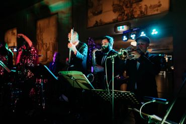 The standard lineup features a five-piece band with three dynamic vocalists, delivering a rich and energetic sound. For larger events, an optional three-piece horn section brings added flair and brassy excitement.